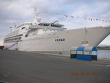 Our cruise ship MS Perla (Περλ&alpha in Greek) carried 770 of us eclipse weenies. In contrast, on my first eclipse trip, the Carnival ship Fascination had close to 3000 passengers, so this was a smaller boat. While they didn't have the exercise facilities I liked aboard the Fascination, seven "cardio" machines instead of jogging track and full weight room, they had the same full-service attitude in both my steward and the dining-room staff. They also had three computers with satellite Internet service, expensive for images, cheap for text e-mail like mine, and annoyingly slow in its response time.