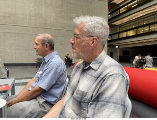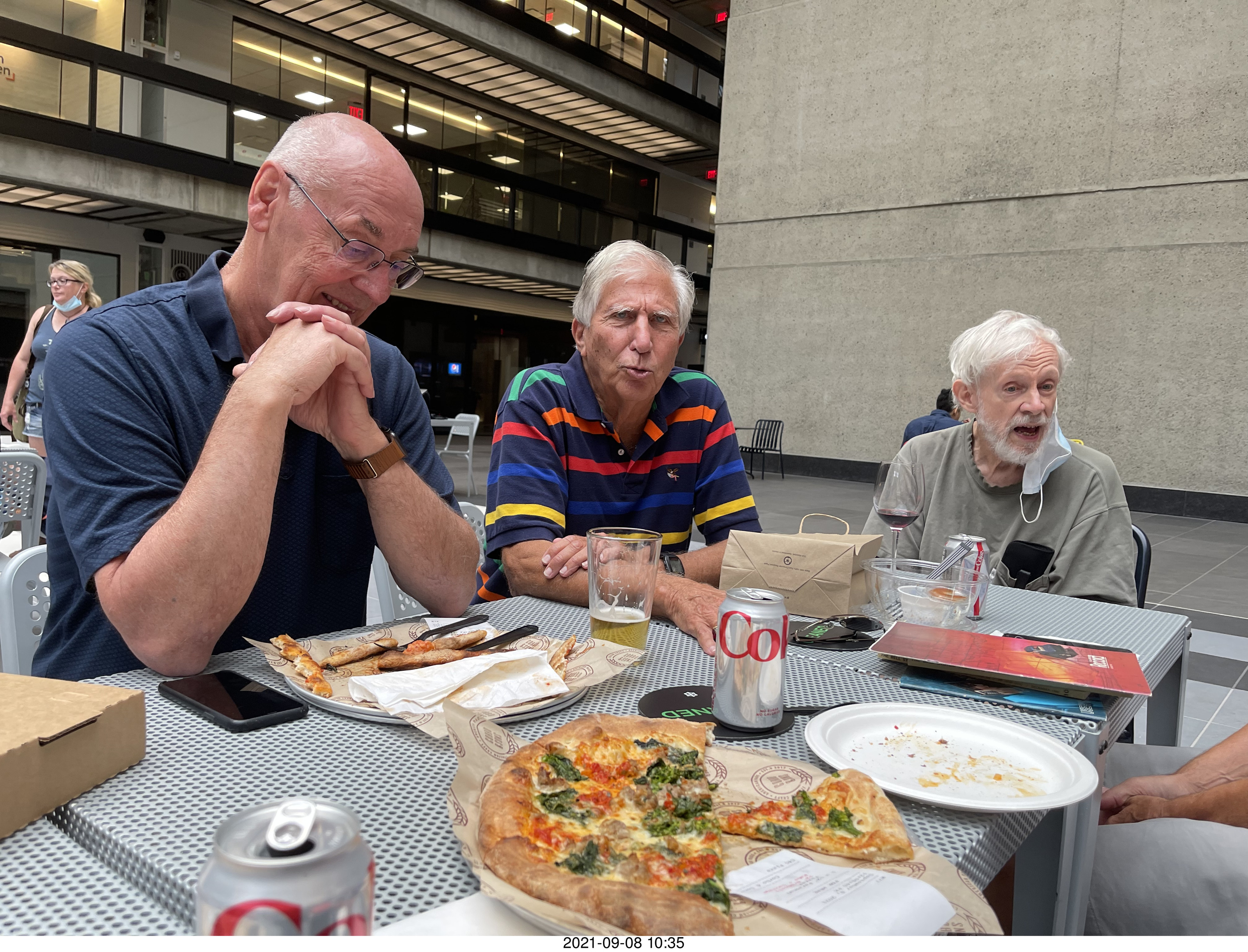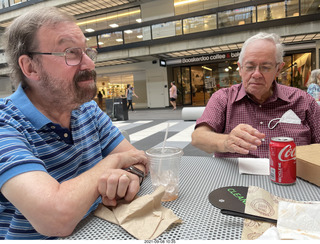 We had a Zoom meeting in 2021 July and we planned our first post-COVID face-to-face lunch 2021 September 8, Wednesday, at the Crown Palace restaurant. The restaurant was too short-staffed to serve us all at a table, so we all drove to the old Holmdel building, now called BellWorks, with a community-center-style mall and food court in the "ginormous" atrium. Eight of us showed up, Mike, Gaston, John, Dick, Mac, Nelson, Jim, and myself.