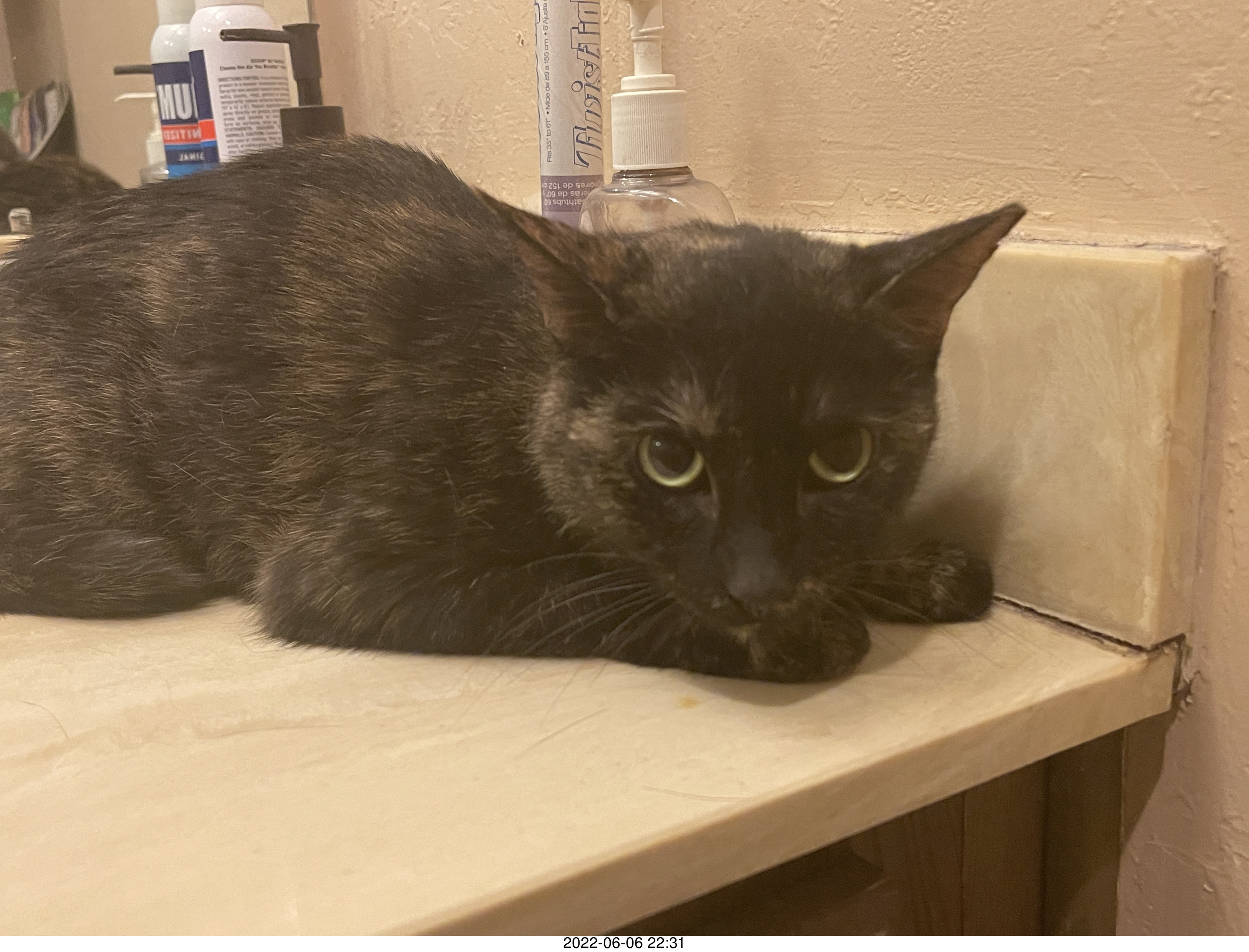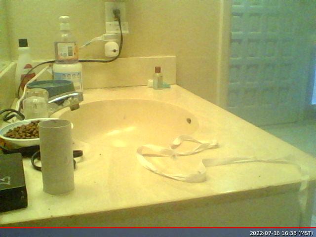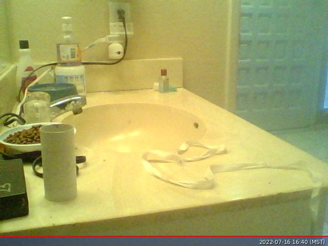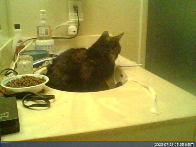 2022 July 8, Friday. The upstairs construction was finished last night so the time has come. I left the bathroom door open and walked away so Miss Pris can leave her safe space if she wants or she can stay there if she wants. So far, today, she stayed in her sink space. On the camera, this evening, I saw her wander to the doorway, but I didn't see her leave the room. That she feels her safe space is safe enough to stay is a good thing and she stayed there all day.