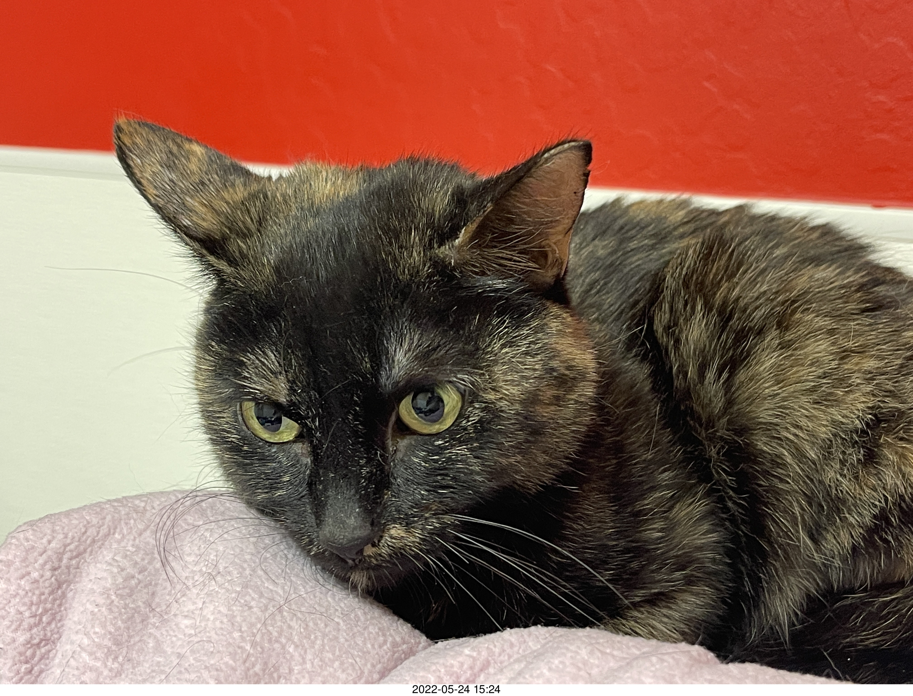 2022 May 24, Tuesday. I looked around for older rescue cats and found Miss Pris at Halo cat rescue. The interview went well, I liked the people there, I liked Miss Pris, and she seemed to like me, at least in the comfort of the room she called home. She clearly didn't enjoy the ride home in the carrier in my car, but she didn't spend the whole trip yowling and complaining like all my other cats during car ride (including Max, by the way). I weighed her, 3 Kg, 6.6 pounds. I put Miss Pris into the downstairs bathroom with food, water, and kitty litter for a few hours, I introduced her to my friends visiting for dinner, and then I opened the door and let her roam.