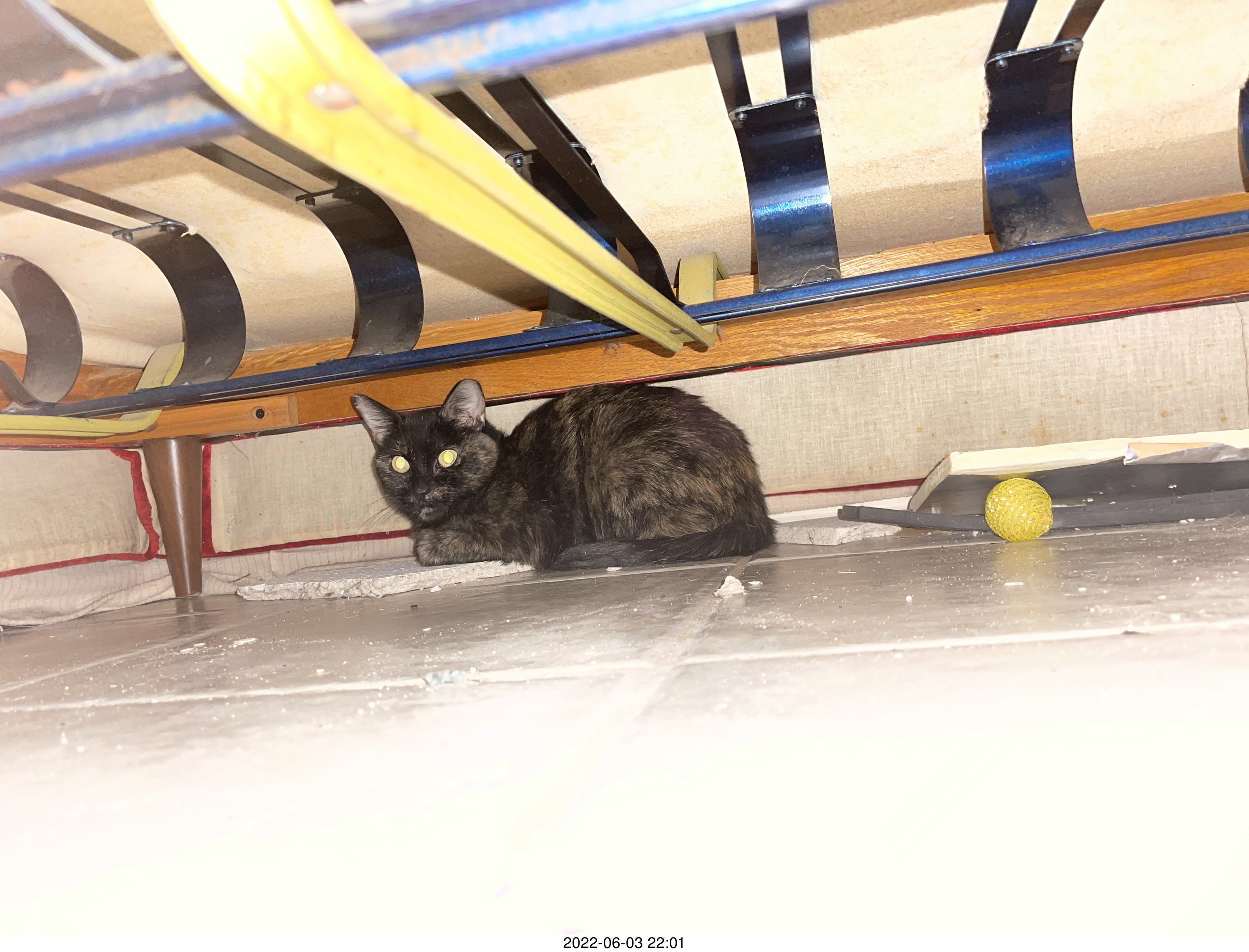 2022 July 9, Saturday, through 2022 July 15, Friday. Miss Pris continued to stay in her safe space. I believe my cats Devin and Jane came in and out a few times to use the litter box and I came in and out with my usual frequency. Her pupils have gone from wide-scared to narrow cat's-eye slits as her comfort increases.