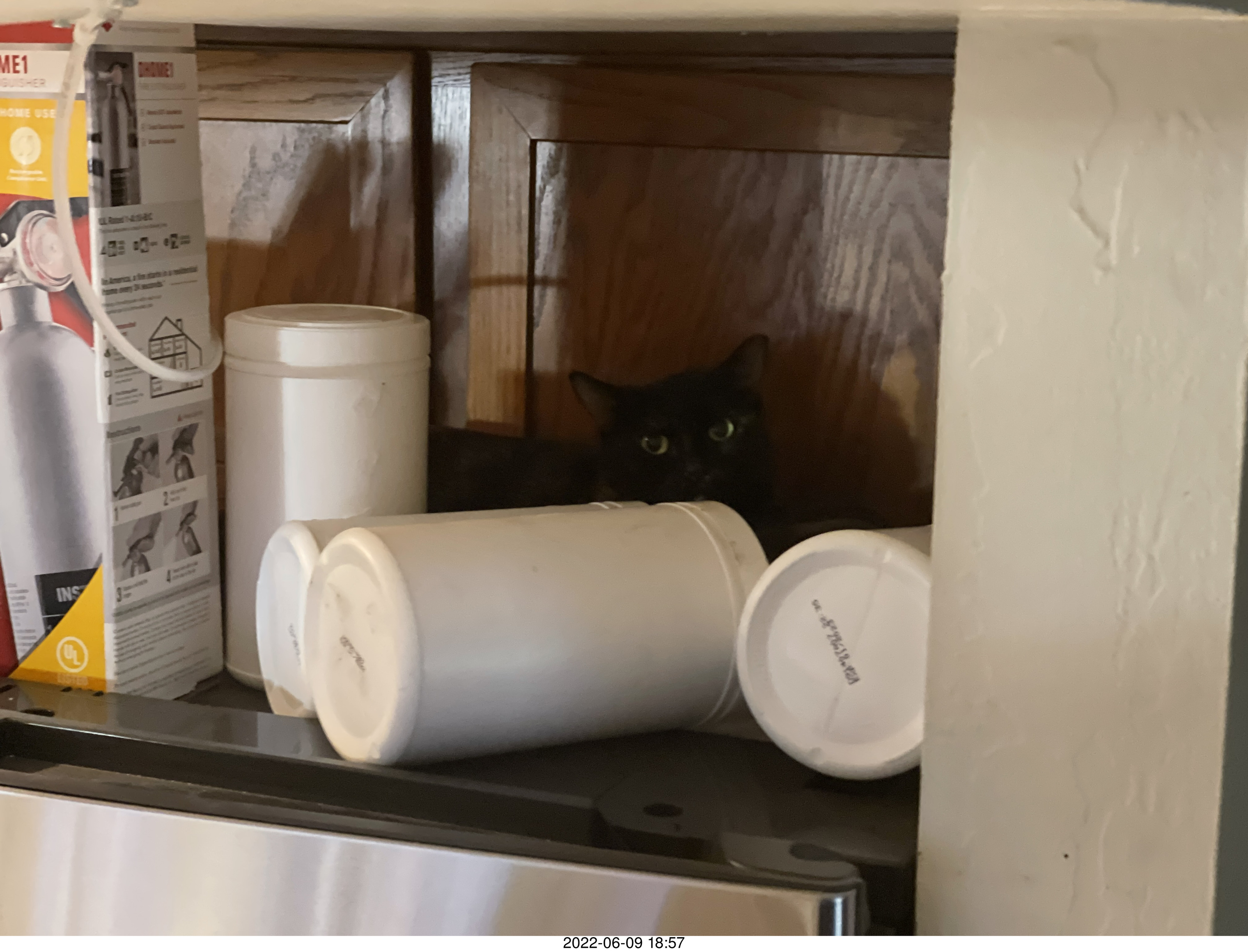 2022 May 27, Friday. After all day without seeing Miss Pris, my friend Anthony, "the guy who can find anything," didn't find her. When we got back from dinner I heard a crash from the kitchen. Miss Pris was heading back to her new hiding spot in the small space behind the refrigerator.