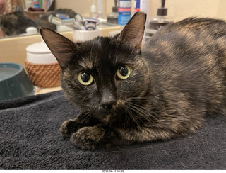 2022 June 29, Wednesday, and 2022 June 30, Thursday. Miss Pris is getting more comfortable and her pupils are no longer in the dilated-scared state when I enter. My other cats Devin and Jane still don't like being in her safe-space room for supervised visits, but they seldom hiss, mostly just meow to get out. With all the noise upstairs I'll keep her here a while longer with water, food, litter box, treats, and frequent snuggles for a while longer. When I leave the door open for a few seconds after I leave her space, she stays put in her sink-and-towels bed rather than try to escape, so I figure she's feeling safe there. When things are quieter I plan to leave the door open and she'll likely find the courage to explore on her own.