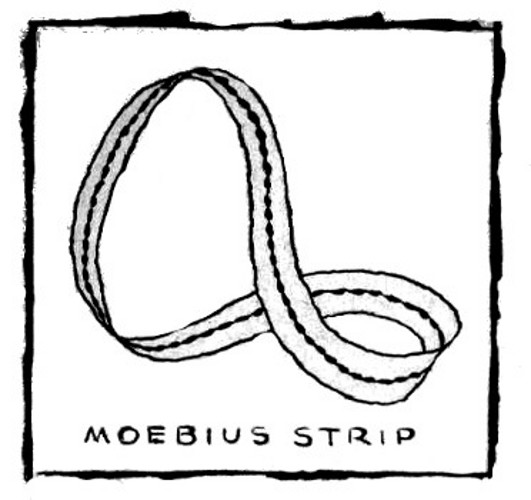 Her long silence made me glance down at her as she was taping the two ends of the paper together. At that point I thought it was an accident that she had given a half twist to the paper strip before joining the circle. I smiled to myself as she picked it up in her chubby fingers.
