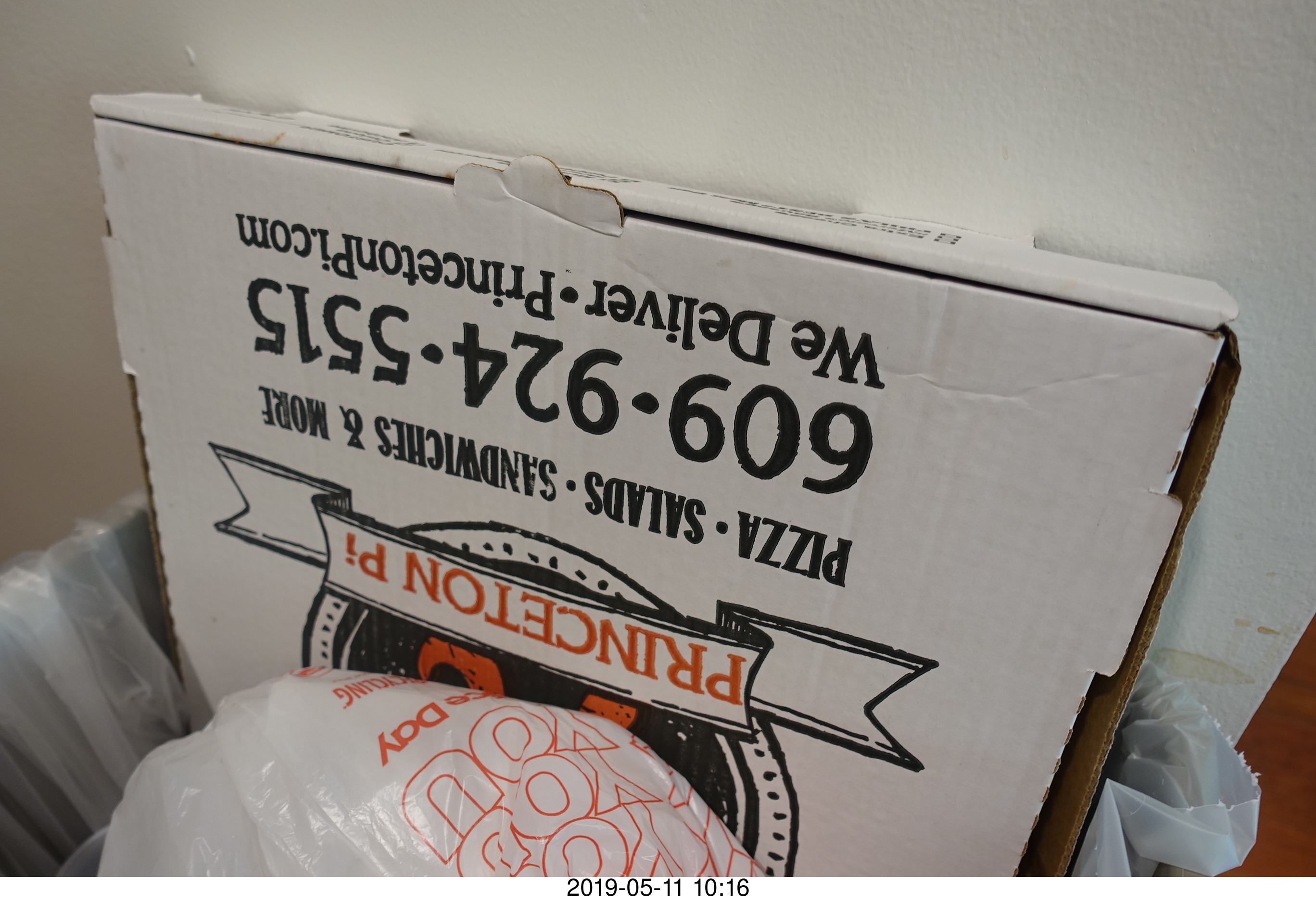busted up transcriptor skeleton vestigal box from russia pick up tag Princeton University - Fine Hall - Princeton Pi pizza box