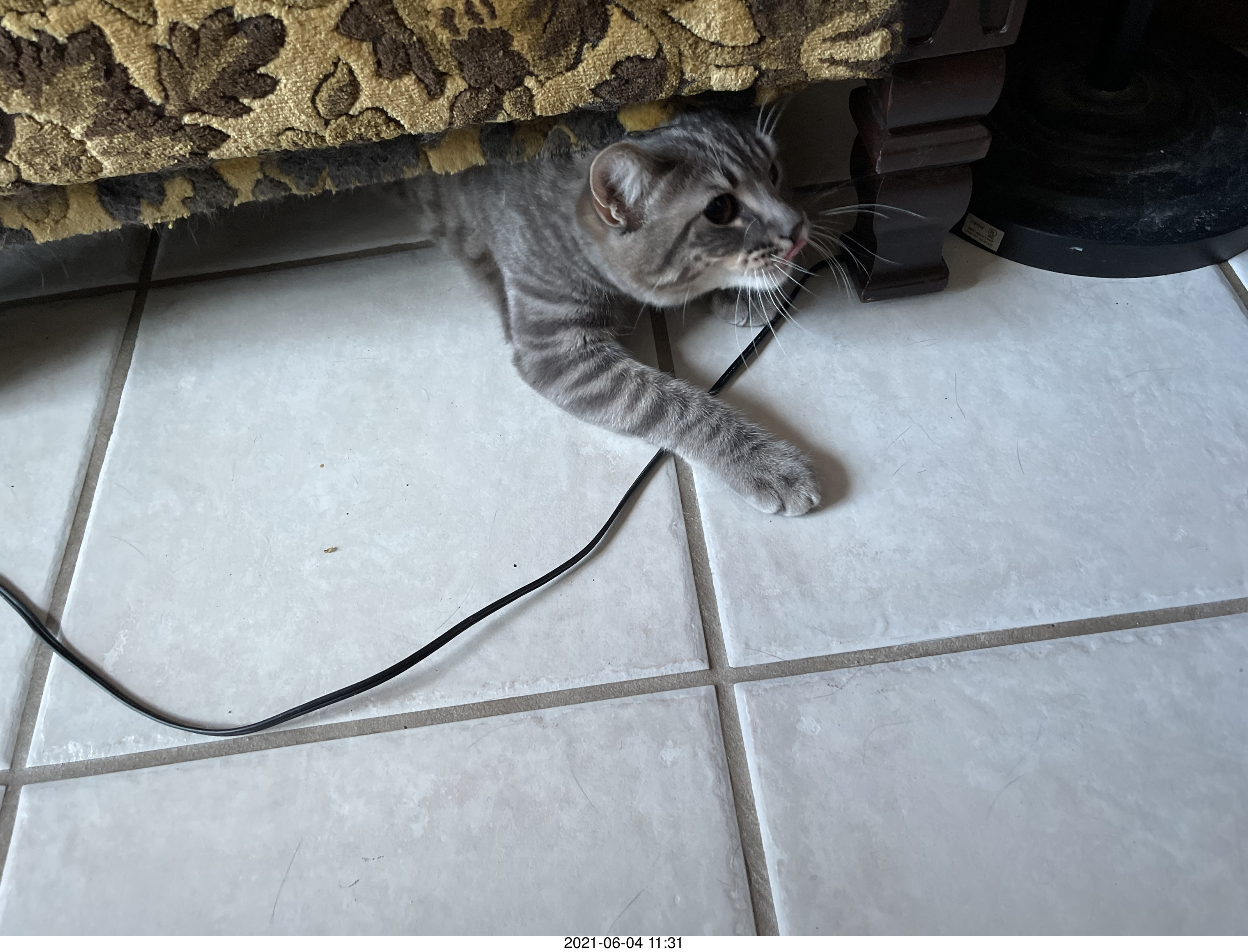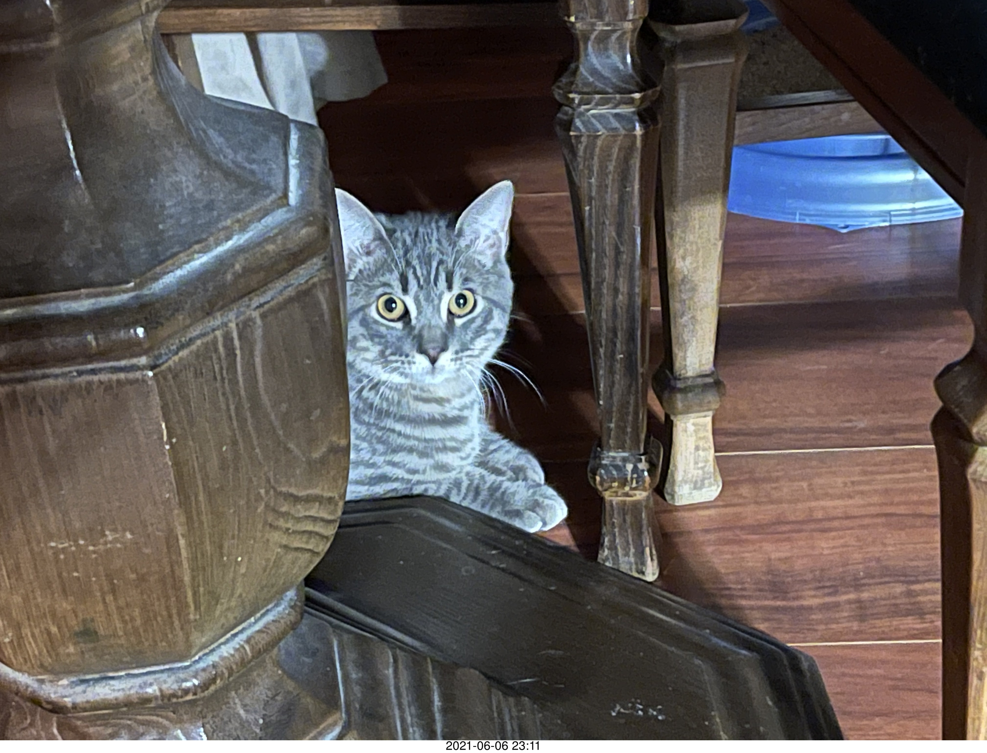 61. cat Potato hiding under chair at Cat Camp