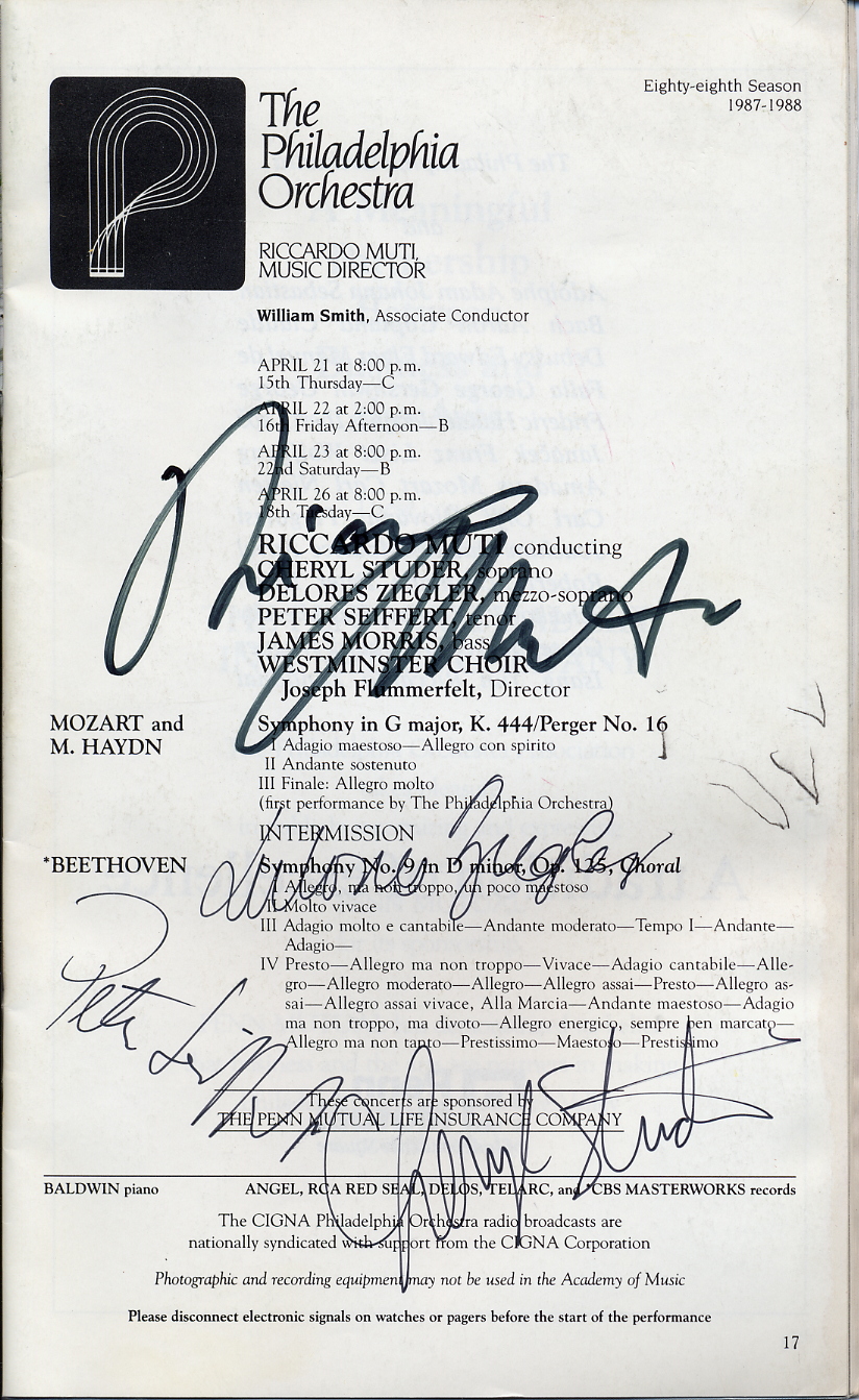 Philadelphia Orchestra program 1988apr22 autographed by Riccardo Muti and others Ricardo Muti and Adam