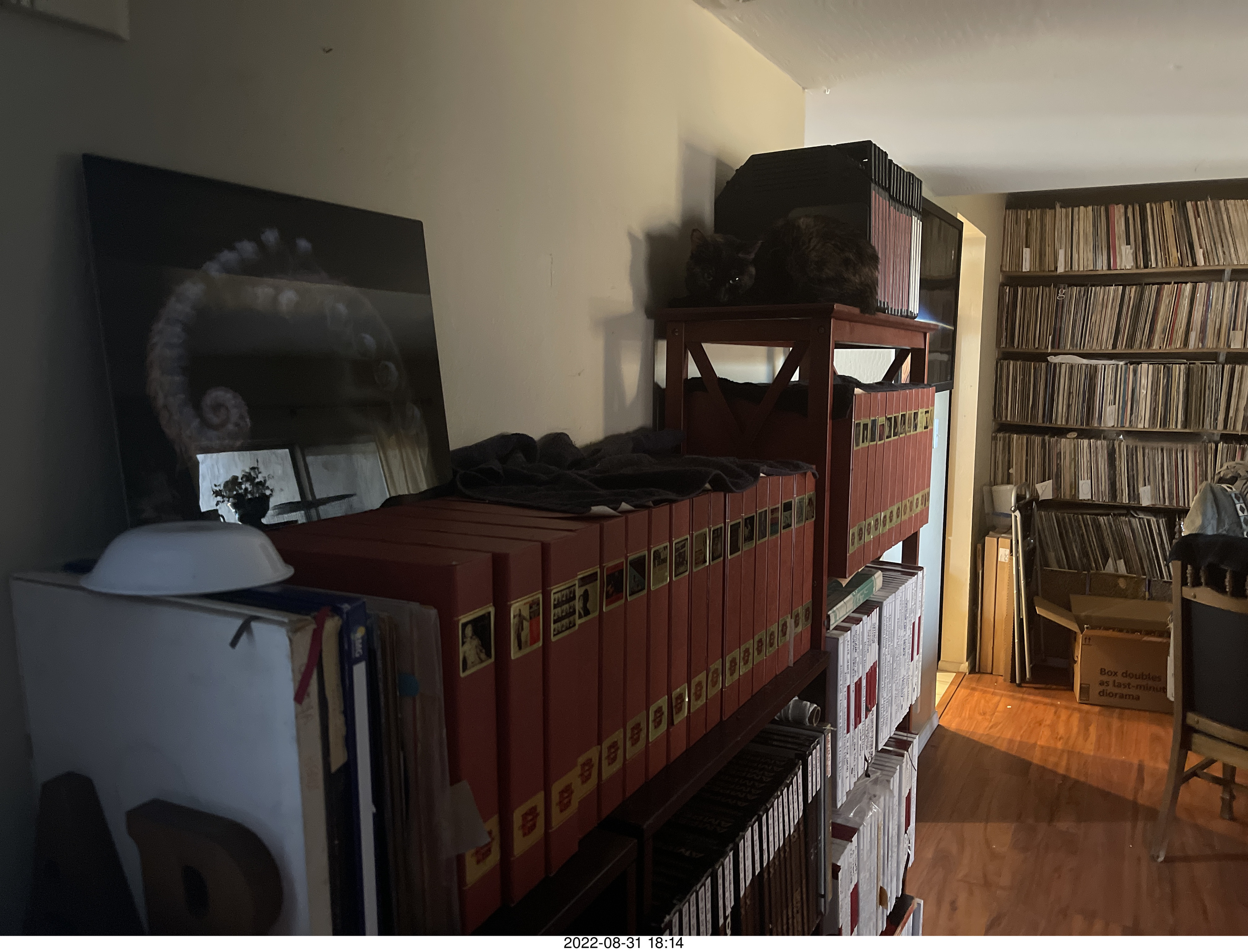 Miss Pris on my tapes my tapes shelf with my cats Miss Pris and Jane