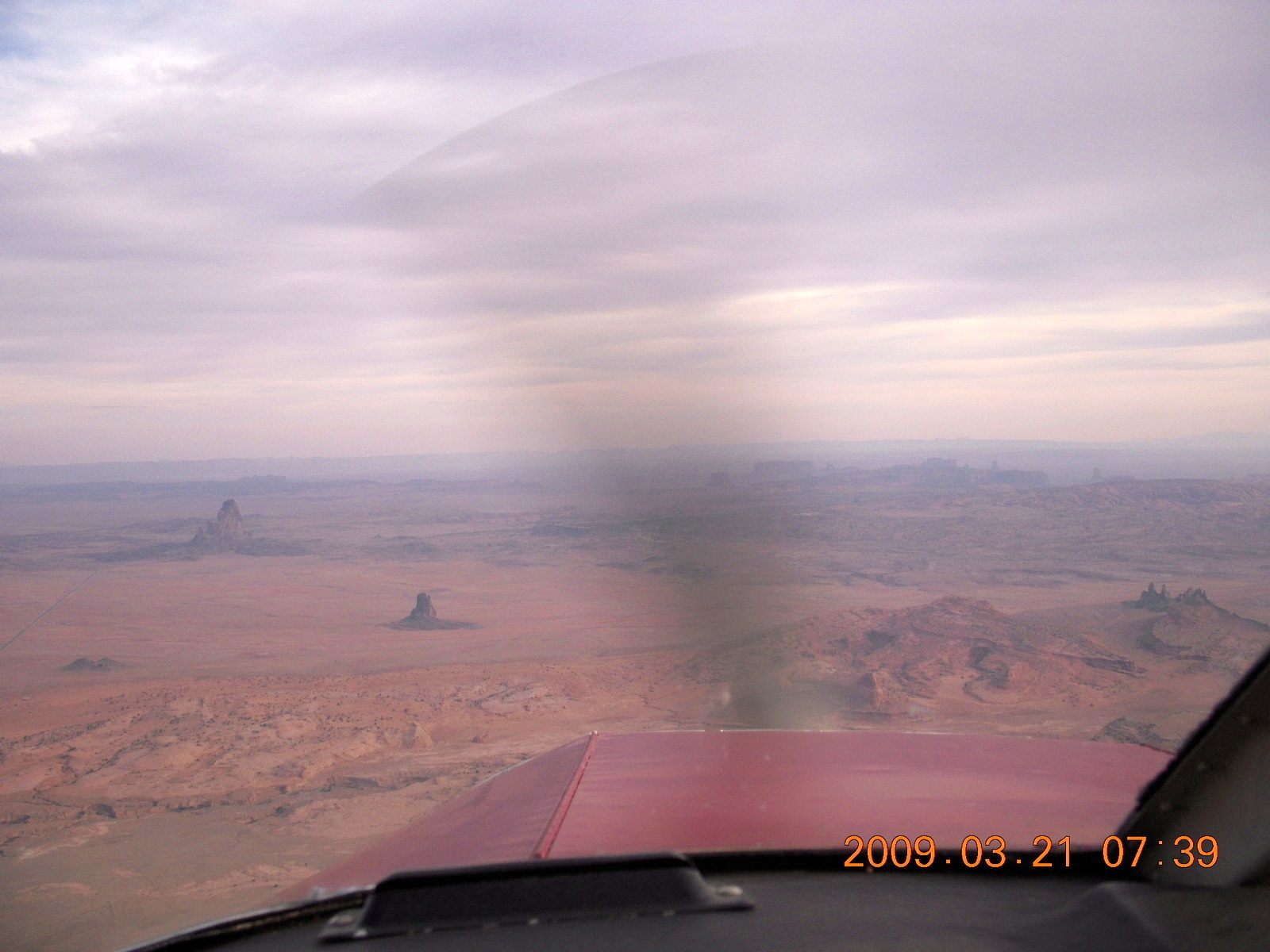 2009 March 21, Saturday, 6tm-n9c.jpg * Monument Valley seen from inside my airplane on the ground