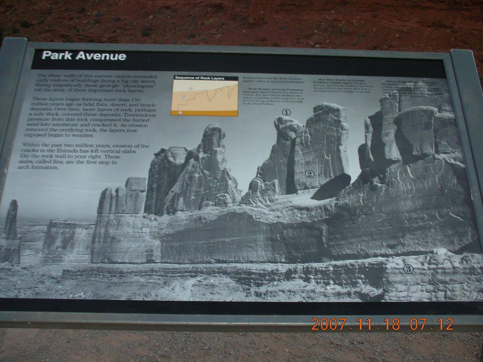 2007 November 18, Sunday, 6bj-zbu.jpg * Arches National Park - Park Avenue Trail at daybreak - sign