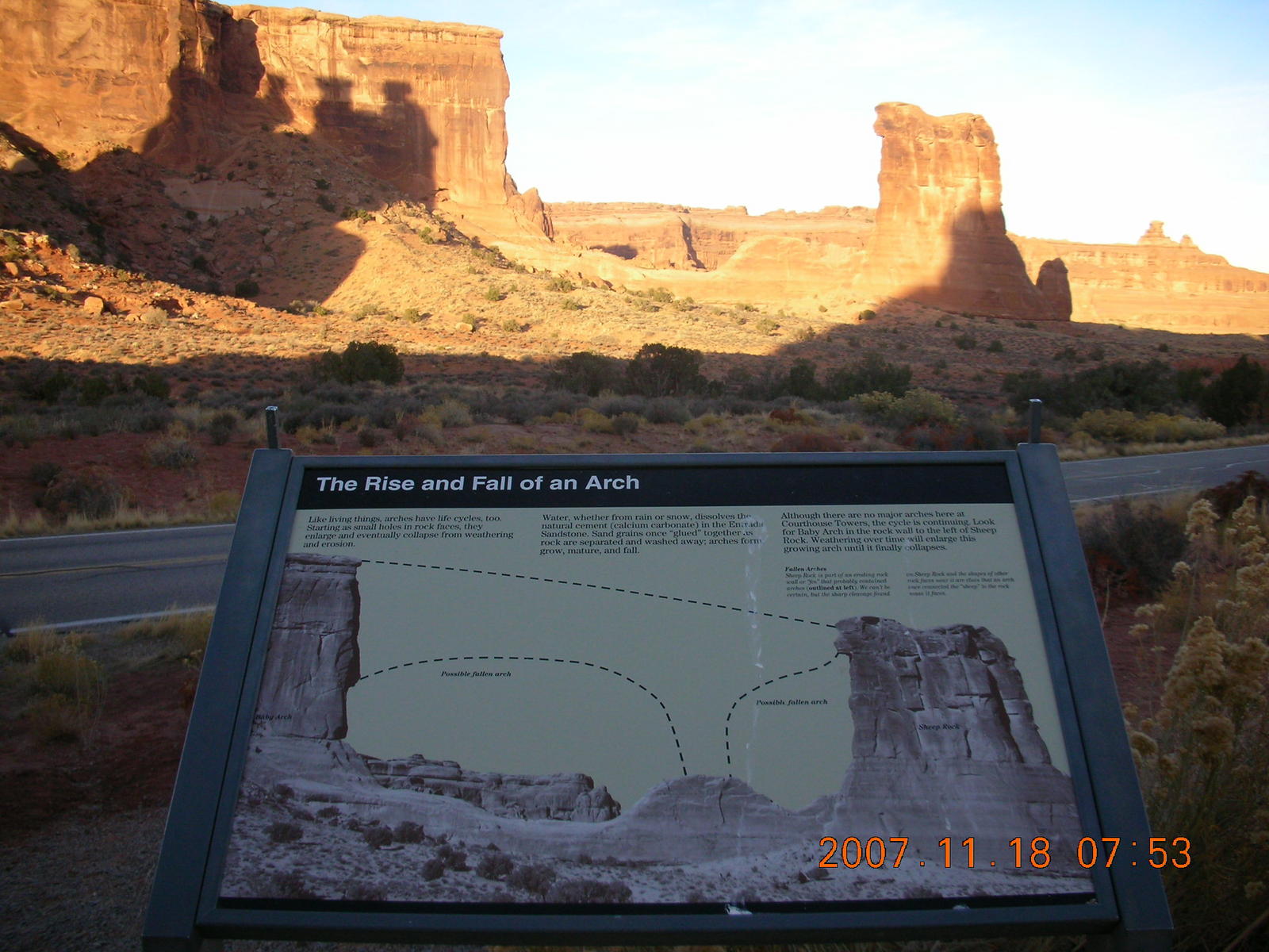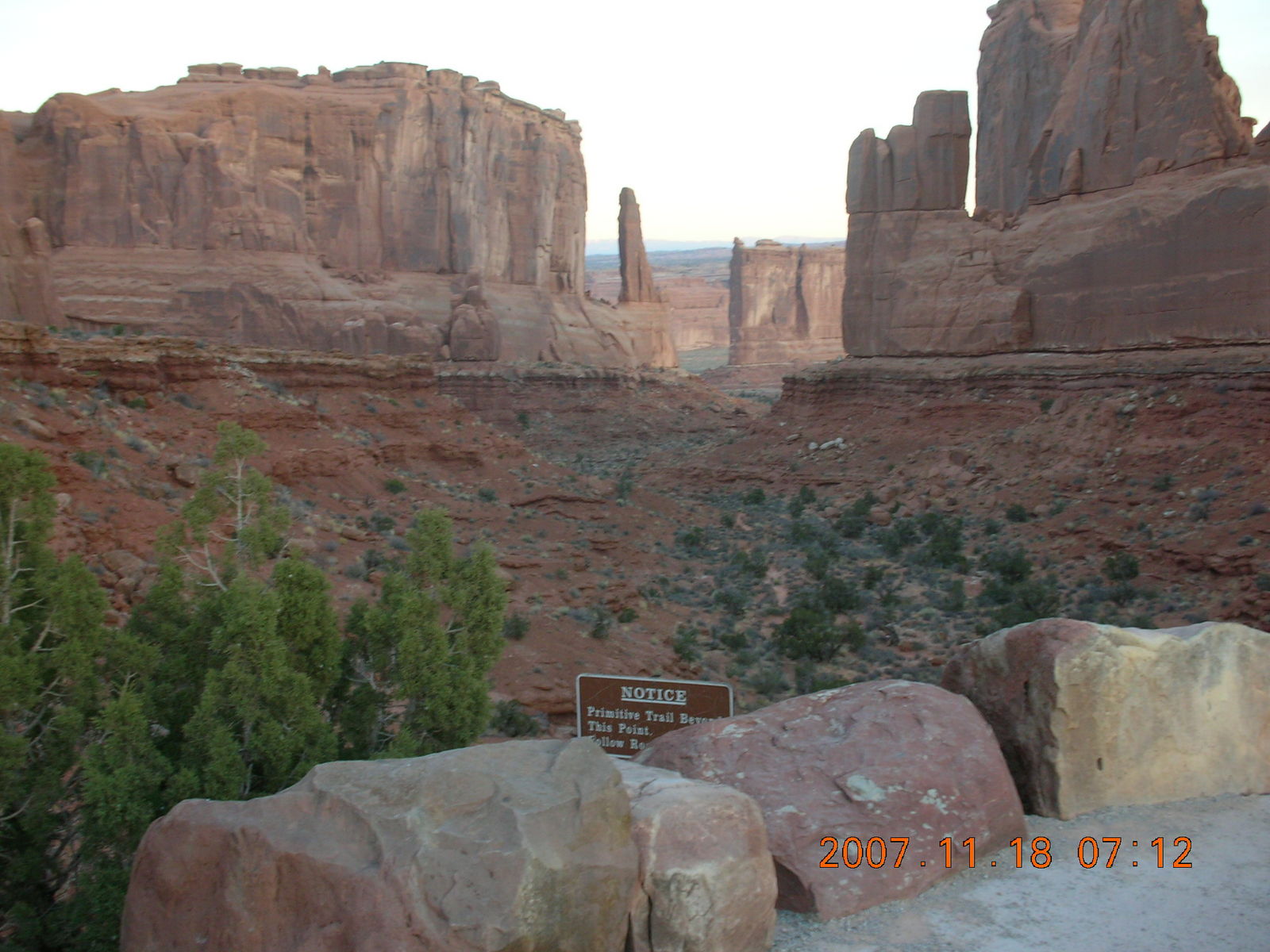 2007 November 18, Sunday, 6bj-zcl.jpg * Arches National Park - Park Avenue Trail at daybreak - sign
