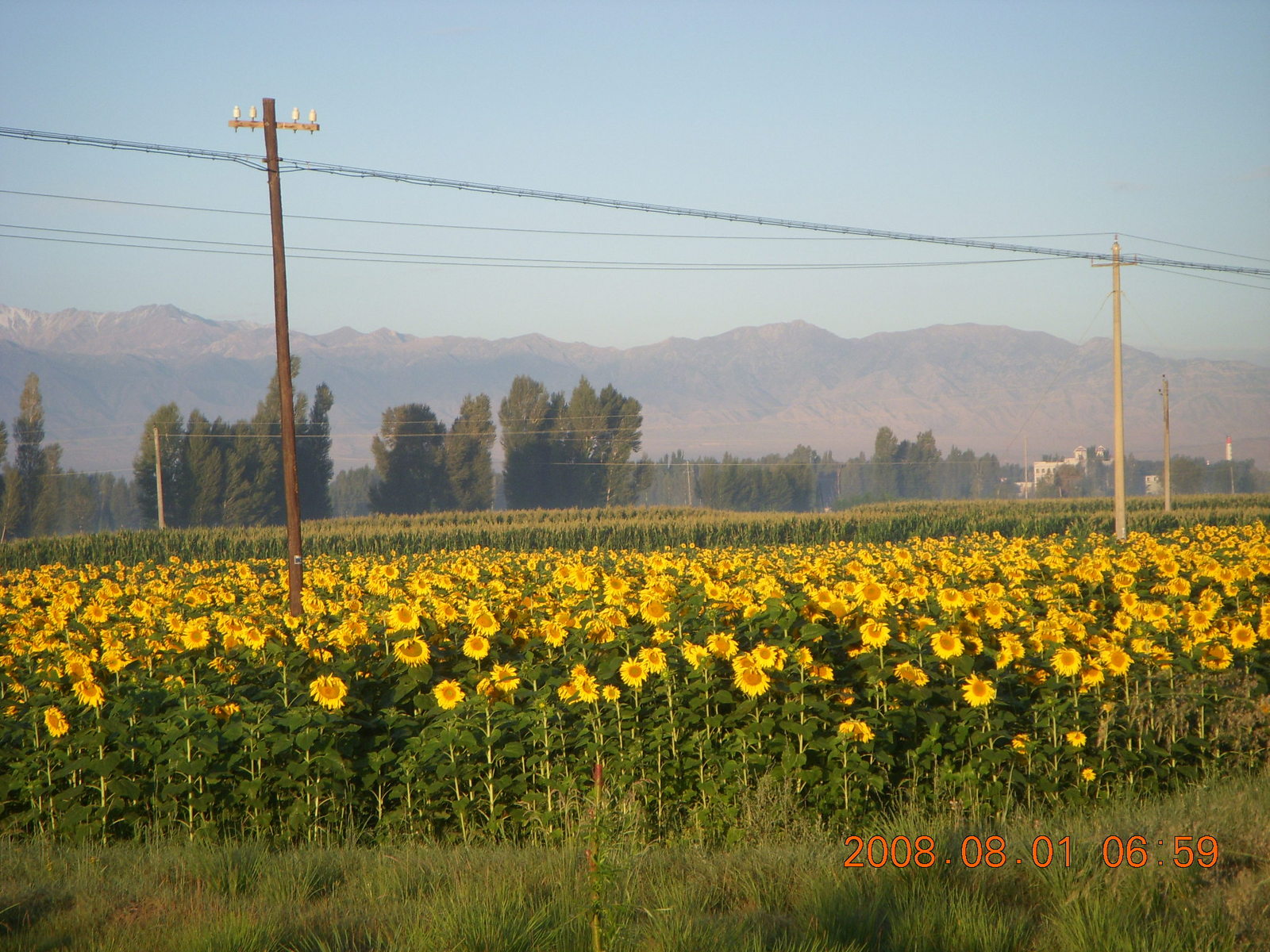 2008 August 3, Sunday, 6l3-s7z.jpg * eclipse - Jiuquan morning run - sunflowers and mountains