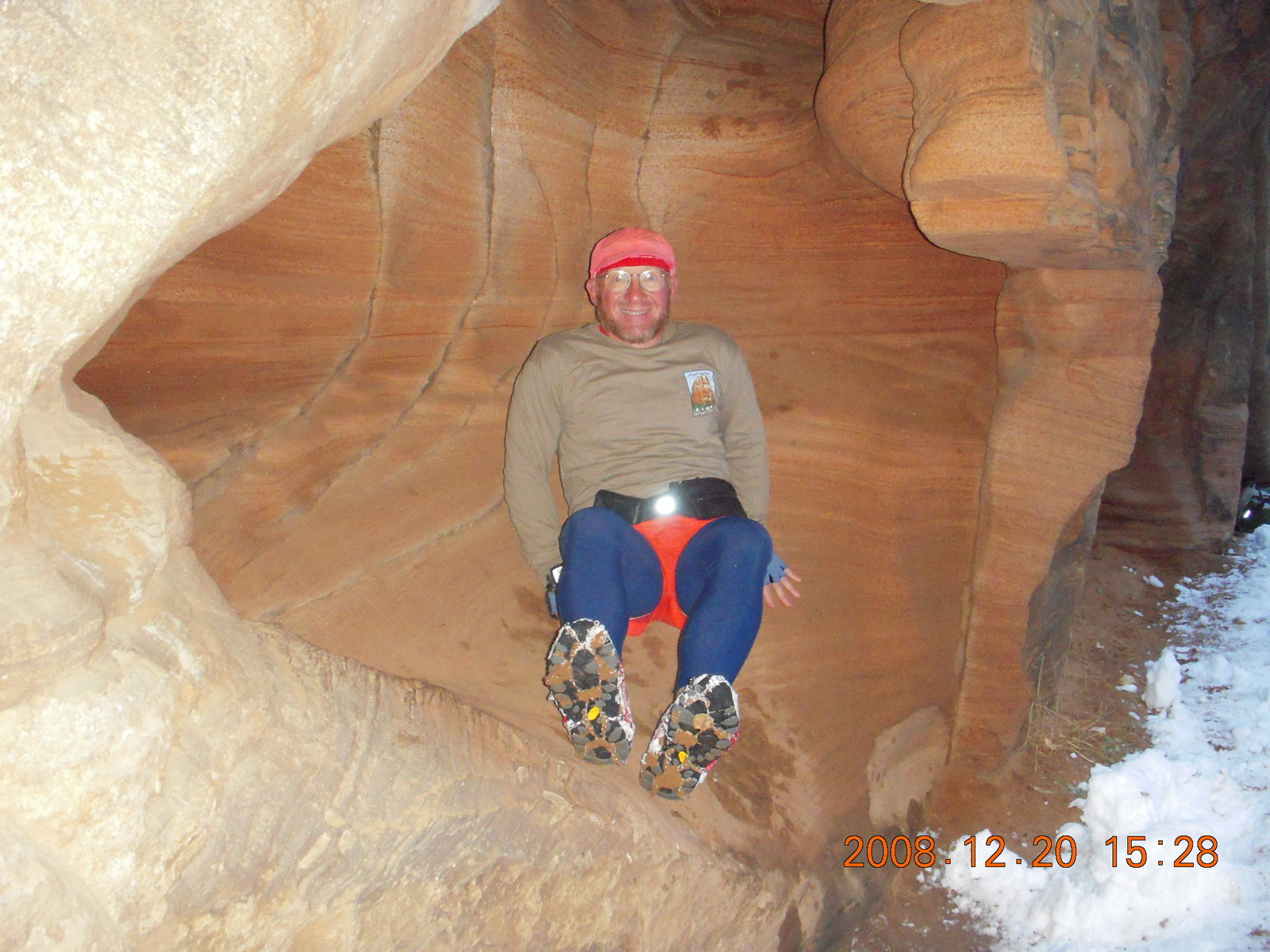 2008 December 21, Sunday, 6qm-tz5.jpg * Zion National Park - Angels Landing hike- Adam in rock in Refrigerator Canyon with crampon bottoms