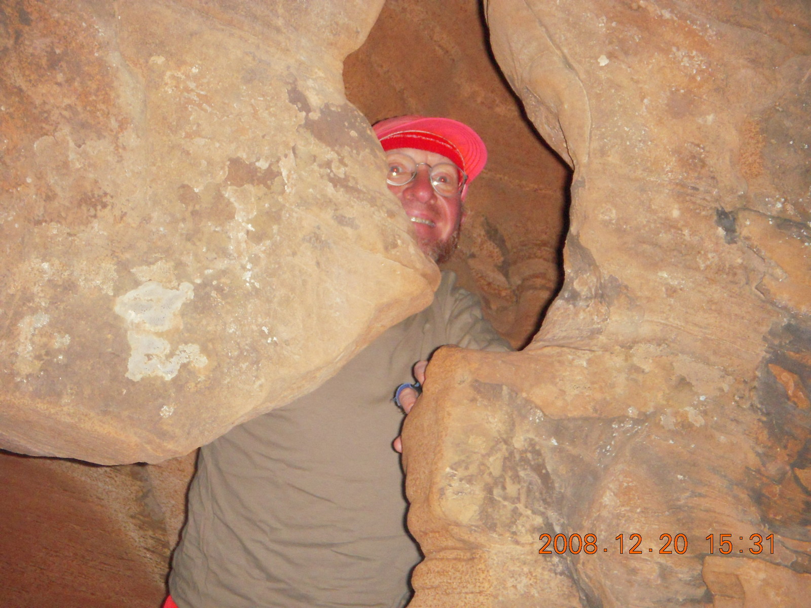 2008 December 21, Sunday, 6qm-tzb.jpg * Zion National Park - Angels Landing hike - Adam peeking through rock in Refrigerator Canyon