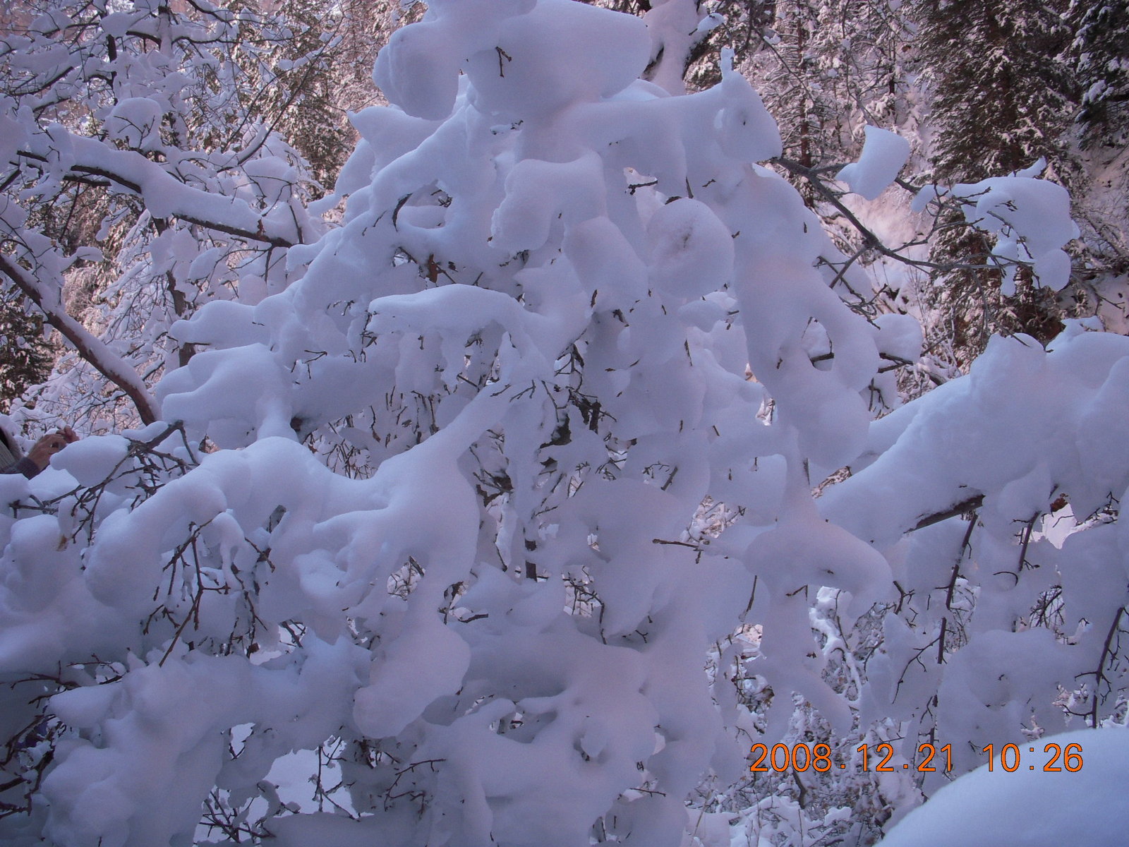 2008 December 21, Sunday, 6qm-v2b.jpg * Zion National Park - Emerald Pools hike - Adam through snowy tree