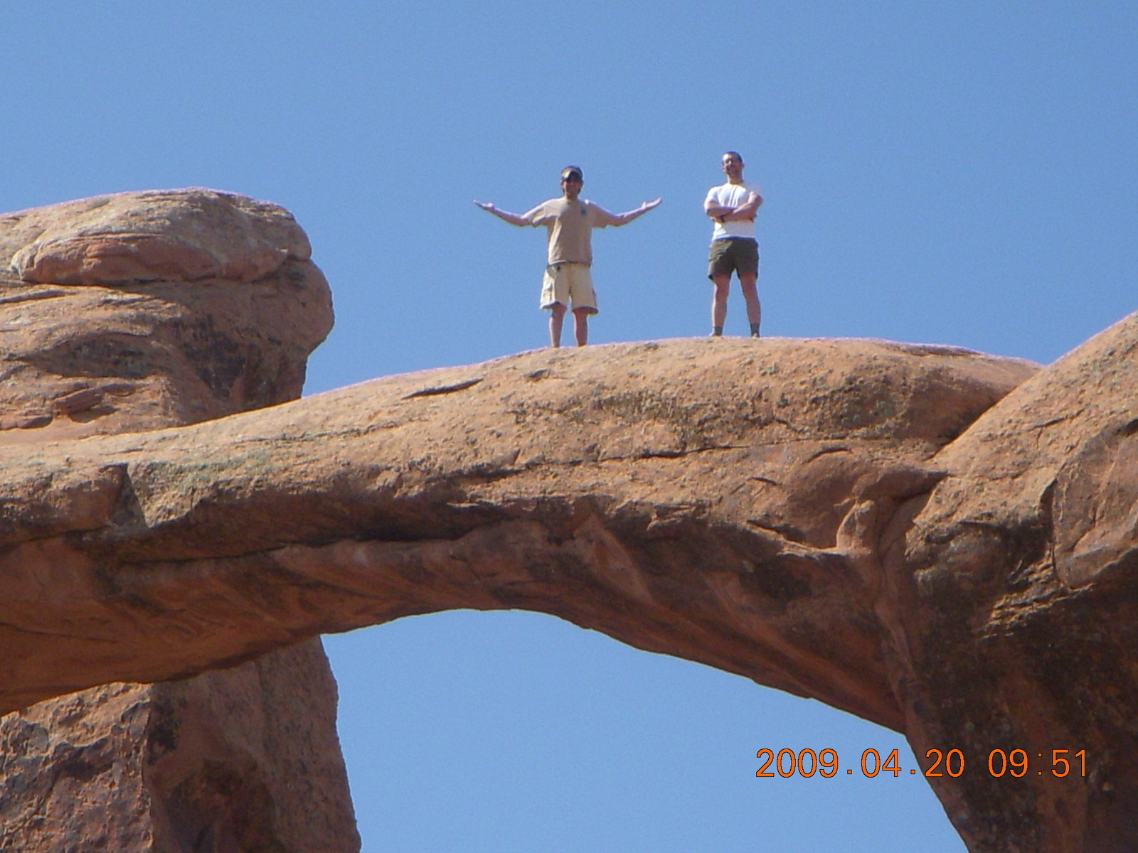 2009 April 20, Monday, 6ul-vut.jpg * Arches National Park - Devil's Garden hike - two fellows atop Double-O Arch