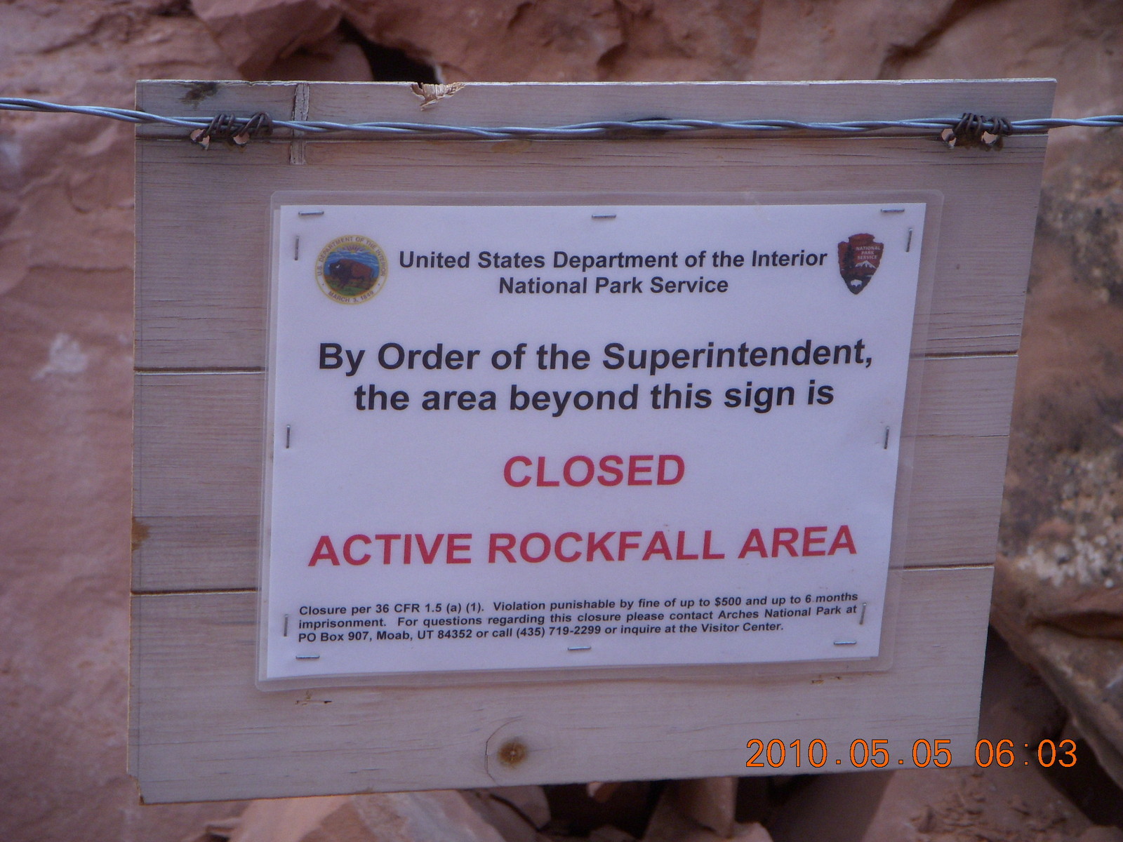 2010 May 6, Thursday, 776-nfd.jpg * Arches National Park - Devil's Garden and Dark Angel hike - Wall Arch sign