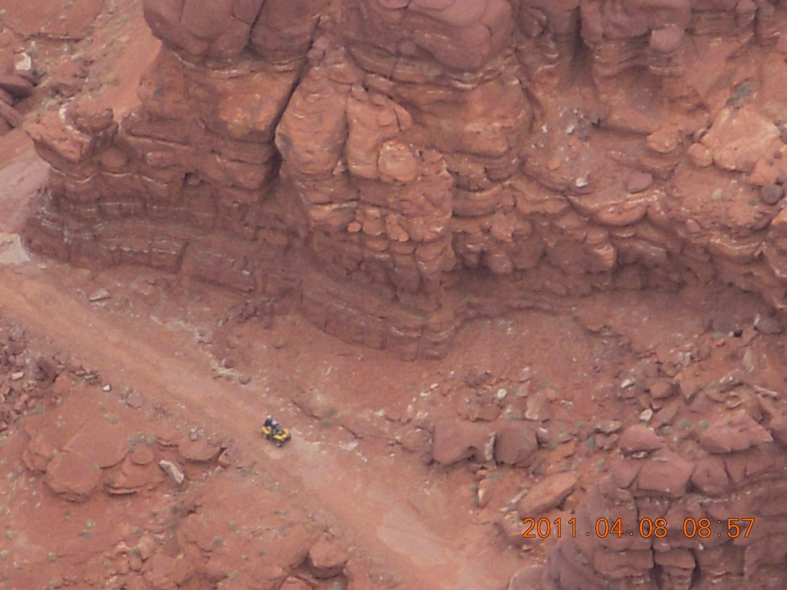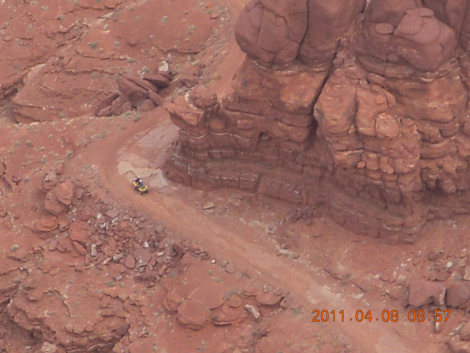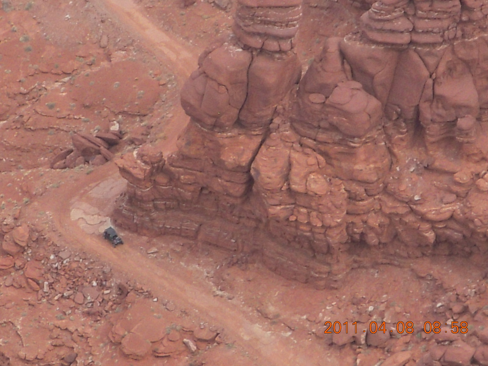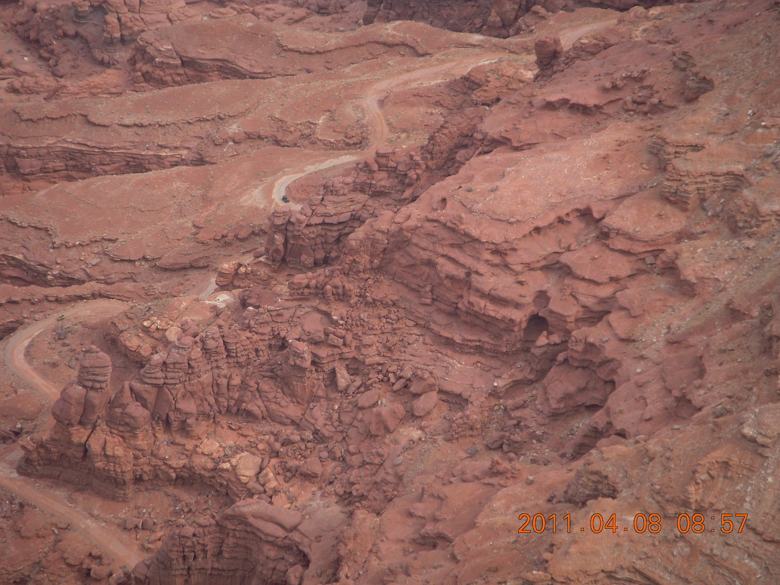 2011 April 8, Friday, 7j8-vu0.jpg * dirt road drive to Anticline Overlook - Rodeo seen from below - looks tough