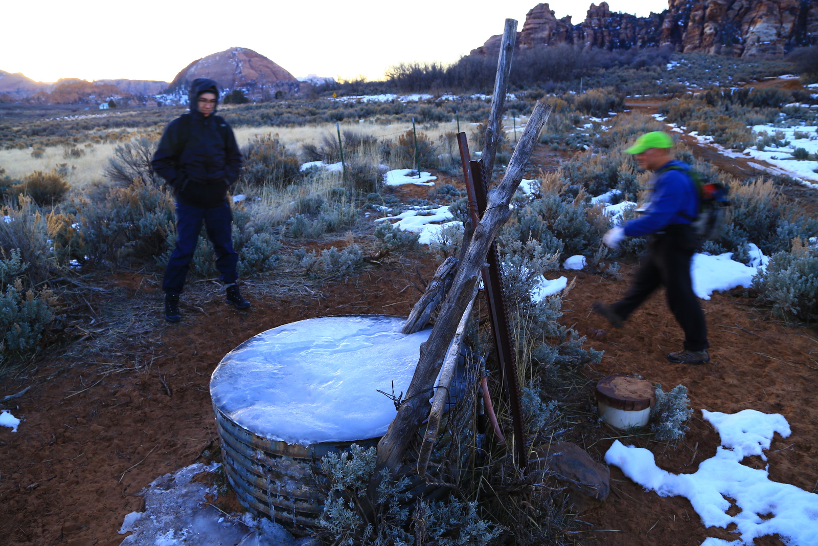 2013 December 29, Sunday, 8gv-t06.jpg * Cave Valley hike - cattle watering dish (a bit frozen) and Brian and Adam