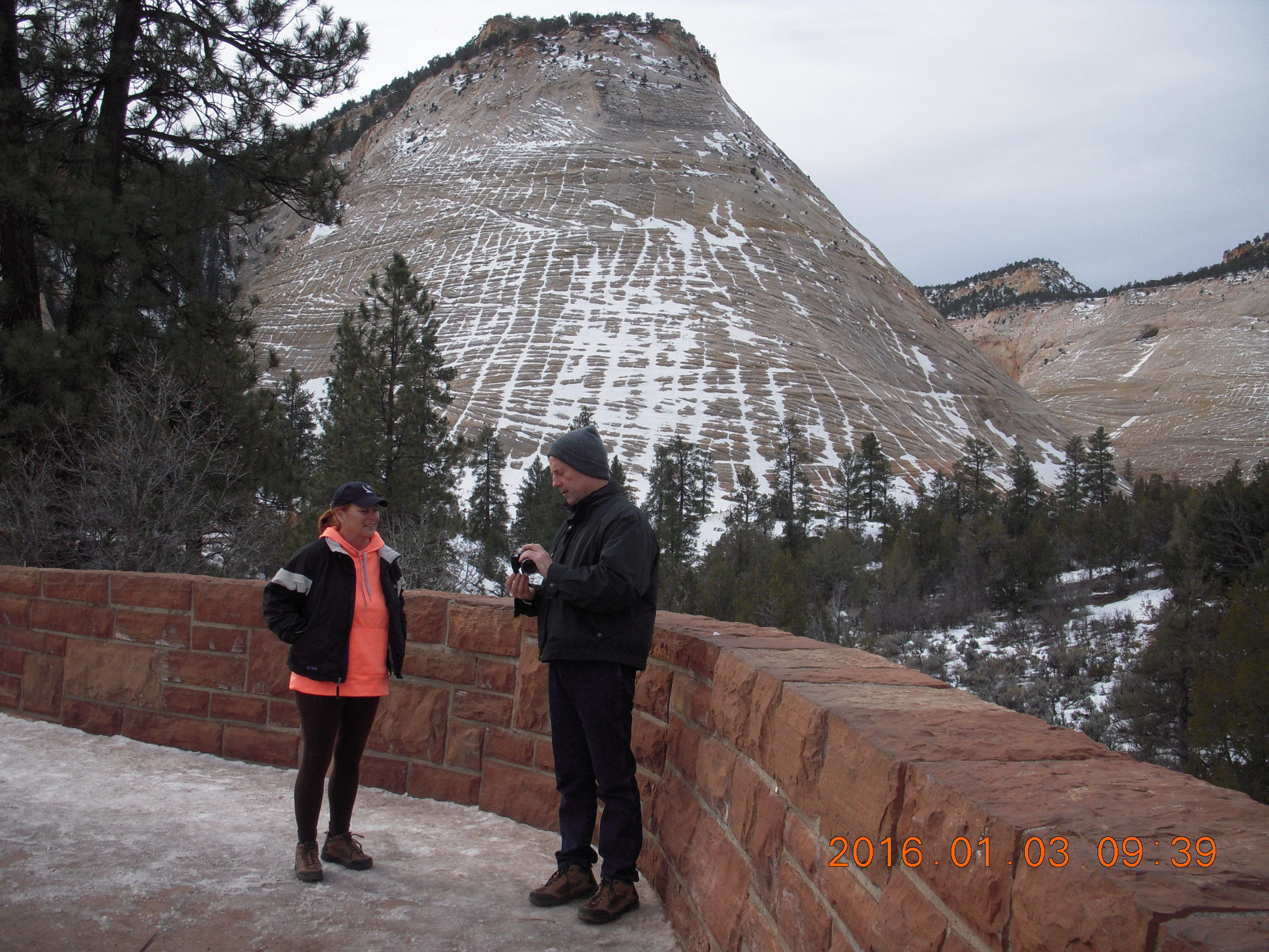 2016 January 3, Sunday, 973-rlz.jpg * Zion National Park - Checkerboard Mesa viewpoint - Kit and Brad
