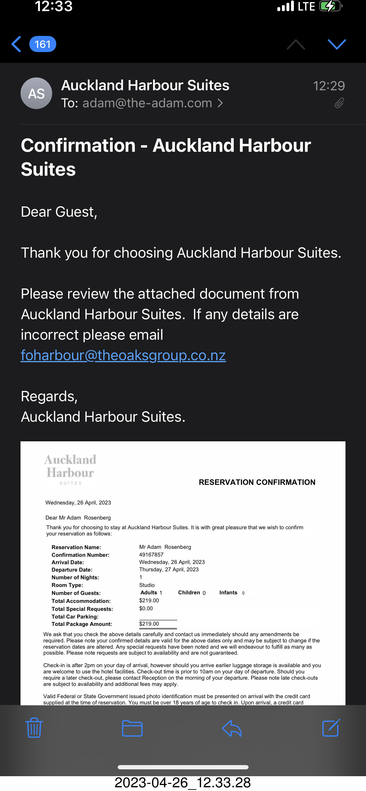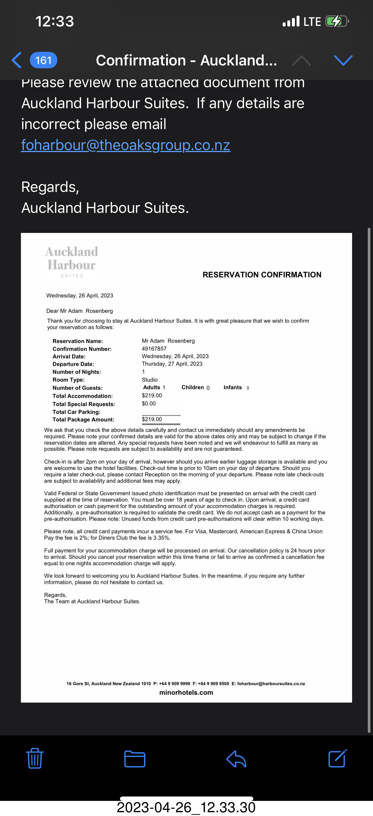 332 a1s. New Zealand - Auckland - hotel confirmation
