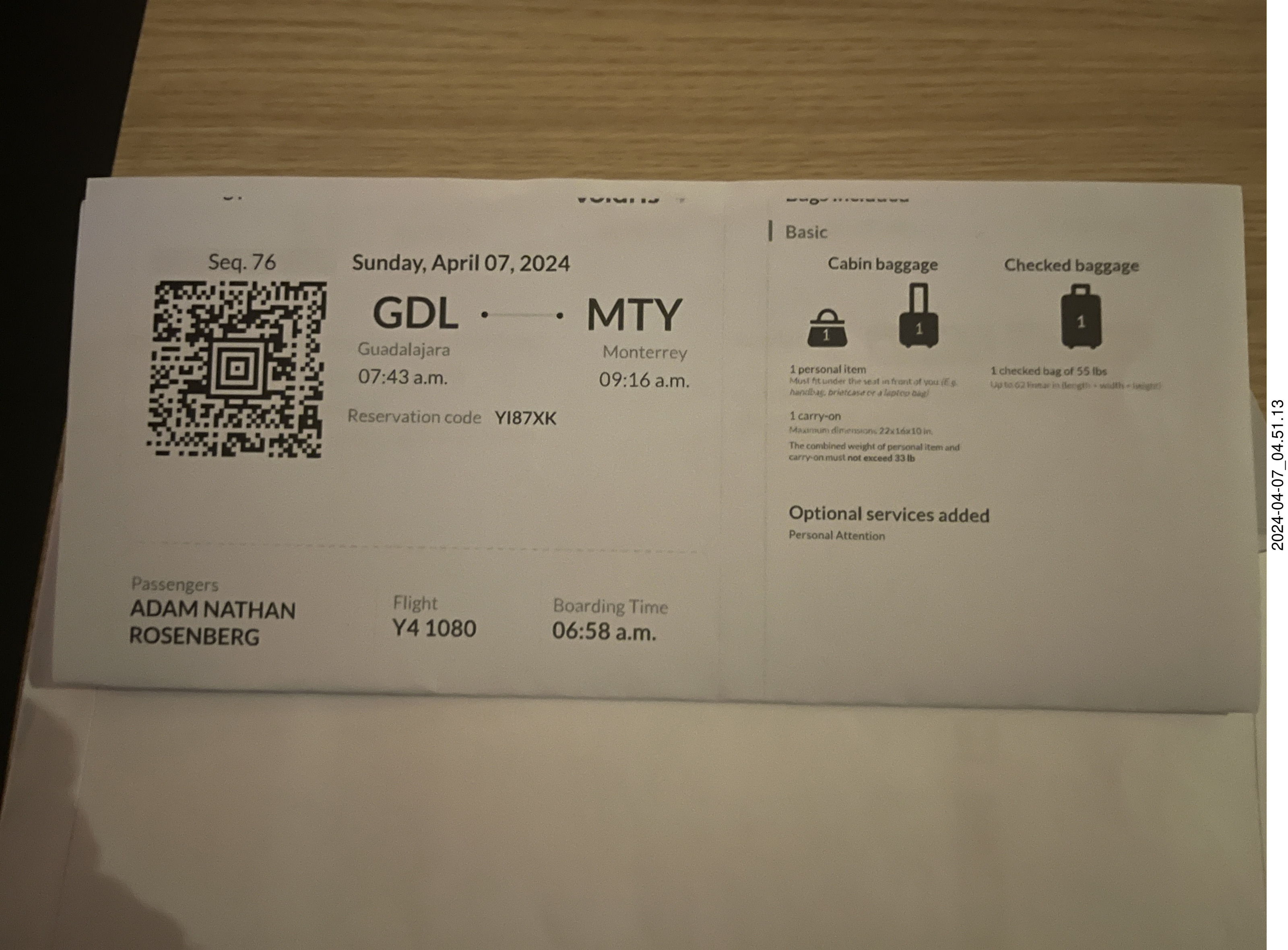 2024 April 7, Sunday, c47-vvn.jpg * boarding pass Guadalajara to Monterrey (GDL-MTY-0743-0916/Y4-1080) on Volaris