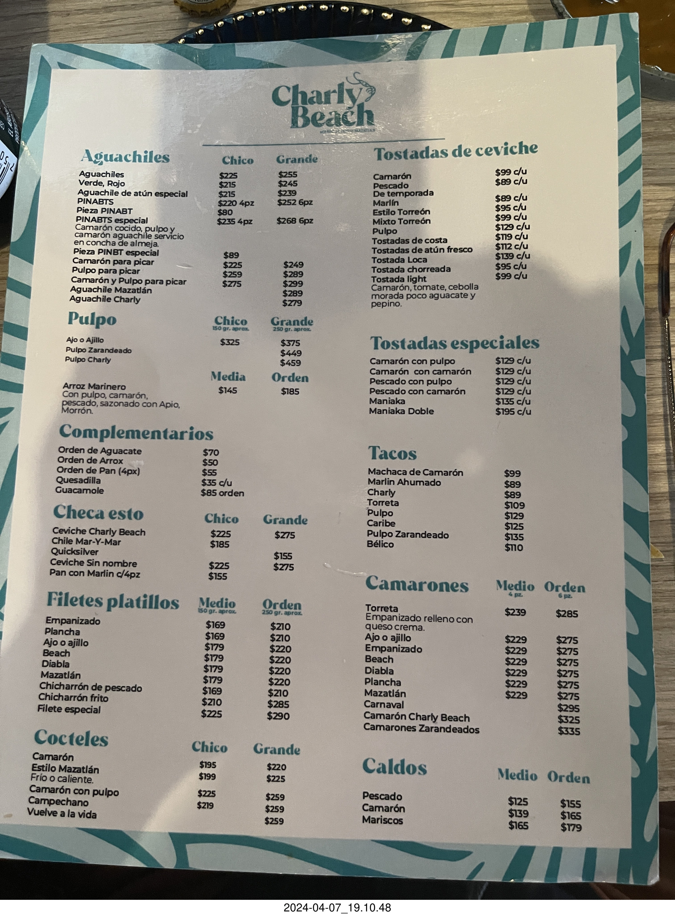 2024 April 7, Sunday, c47-vx2.jpg * Torreon - Charly Beach restaurant - menu